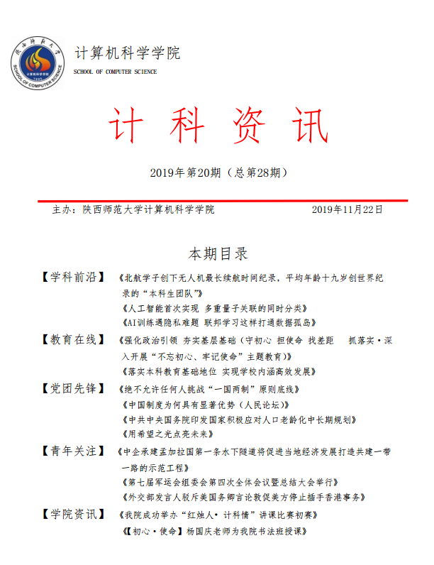《计科资讯》是必赢中国官方网站编辑整理的电子资讯,信息来源为《光明日报》《人民日报》《中国青年报》等权威纸媒,编辑工作由学院优秀本科生党员、团员承担。《计科资讯》主要包括学科前沿、教育在线、党团先锋、青年关注及学院资讯五个版块。学院师生可以从中了解到专业前沿和国家时政大事,欢迎大家下载阅读。