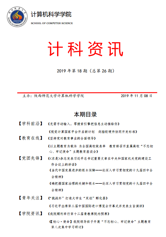 《计科资讯》是必赢中国官方网站编辑整理的电子资讯,信息来源为《光明日报》《人民日报》《中国青年报》等权威纸媒,编辑工作由学院优秀本科生党员、团员承担。《计科资讯》主要包括学科前沿、教育在线、党团先锋、青年关注及学院资讯五个版块。学院师生可以从中了解到专业前沿和国家时政大事,欢迎大家下载阅读。