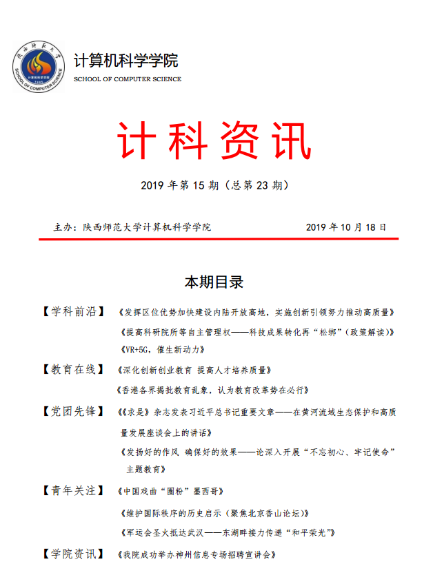 《计科资讯》是必赢中国官方网站编辑整理的电子资讯,信息来源为《光明日报》《人民日报》《中国青年报》等权威纸媒,编辑工作由学院优秀本科生党员、团员承担。《计科资讯》主要包括学科前沿、教育在线、党团先锋、青年关注及学院资讯五个版块。学院师生可以从中了解到专业前沿和国家时政大事,欢迎大家下载阅读。