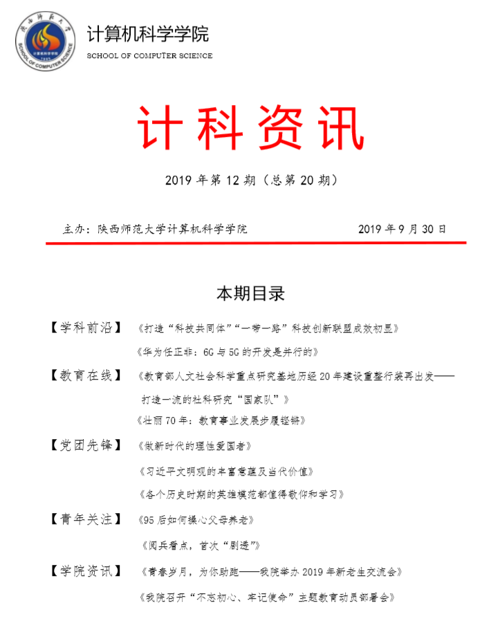 《计科资讯》是必赢中国官方网站编辑整理的电子资讯,信息来源为《光明日报》《人民日报》《中国青年报》等权威纸媒,编辑工作由学院优秀本科生党员、团员承担。《计科资讯》主要包括学科前沿、教育在线、党团先锋、青年关注及学院资讯五个版块。学院师生可以从中了解到专业前沿和国家时政大事,欢迎大家下载阅读。