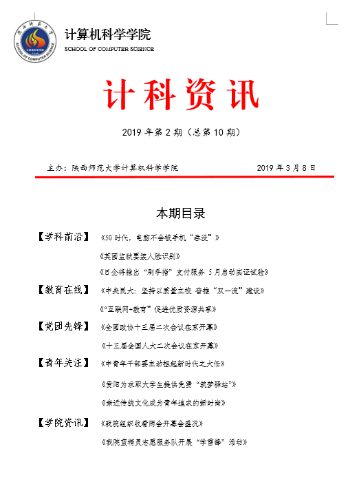 《计科资讯》是必赢中国官方网站编辑整理的电子资讯,信息来源为《光明日报》《人民日报》《中国青年报》等权威纸媒,编辑工作由学院优秀本科生党员、团员承担。《计科资讯》主要包括学科前沿、教育在线、党团先锋、青年关注及学院资讯五个版块。学院师生可以从中了解到专业前沿和国家时政大事,欢迎大家下载阅读。