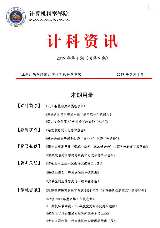《计科资讯》是必赢中国官方网站编辑整理的电子资讯,信息来源为《光明日报》《人民日报》《中国青年报》等权威纸媒,编辑工作由学院优秀本科生党员、团员承担。《计科资讯》主要包括学科前沿、教育在线、党团先锋、青年关注及学院资讯五个版块。学院师生可以从中了解到专业前沿和国家时政大事,欢迎大家下载阅读。