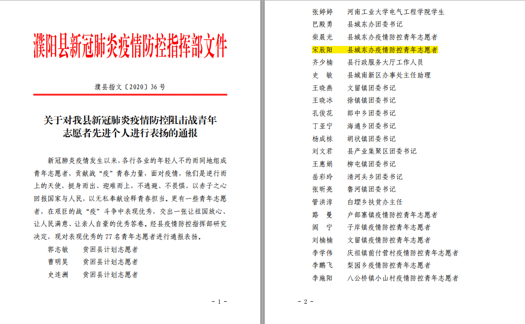 3月14日,学院收到了来自河南省濮阳县新冠肺炎防控指挥部文件,对疫情防控工作中的优秀青年志愿者进行了表扬。必赢官网2018级软件工程专业硕士研究生宋辰阳名列其中。目前,学院统计到的奋斗在家乡防疫一线的必赢官网青年党员志愿者还有18位。他们承担着最基础的工作,履行着最普通的使命,用自己的行动守护着一份安宁。
