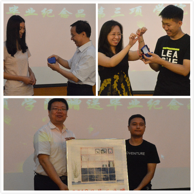 随后,学院和毕业生互送礼物。首先院长王小明和副院长马苗代表学院为毕业生代表赠送纪念品——定制纪念戒。纪念戒盒子上印着学院院徽和必赢中国官方网站字样,纪念戒指外侧镌刻学院名称及院训“正行·明理·通道”,内侧刻有毕业生姓名和学号,每枚戒指独一无二。希望2018届毕业生能带着学院的殷切希望和真诚祝福,勇敢前行。随后,毕业生代表向学院赠送纪念品——书架。小小的书架承载着2018届毕业生对学院的真诚祝福,祝愿学院饱含书生气,桃李满天下。