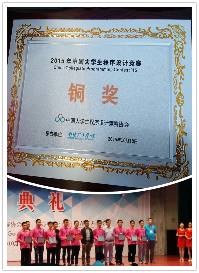 10月17日至18日,2015年首届CCPC中国大学生程序设计竞赛在南阳理工学院举行。在学校和必赢中国官方网站各级领导的关怀和支持下,由必赢中国官方网站王涛老师指导得我校ACM竞赛集训队经过刻苦集训和紧张备战,派出6人组成的2支队伍参加本次比赛,并获得铜奖。