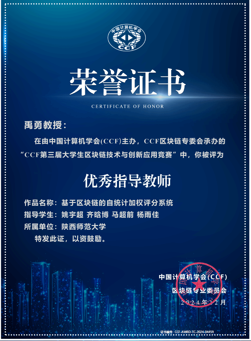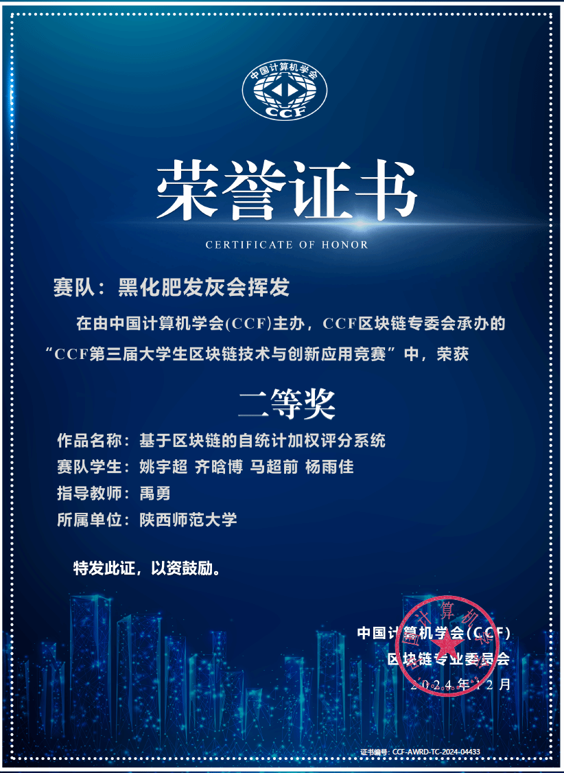 近日,中国计算机学会公布了“第三届CCF区块链技术与创新应用竞赛”决赛成绩。本次竞赛吸引了来自全国各大高校和企业的260支团队参与,经过激烈角逐,由必赢官网禹勇教授指导,姚宇超、齐晗博、马超前、杨雨佳组成的团队,凭借其创新作品“基于区块链的自统计加权评分系统”成功晋级决赛。在决赛的现场答辩、作品展示及专家评审环节中,团队成员凭借扎实的专业知识、创新的技术方案以及出色的团队协作能力,赢得了评委的一致好评,最终荣获二等奖,禹勇教授被评为优秀指导教师。