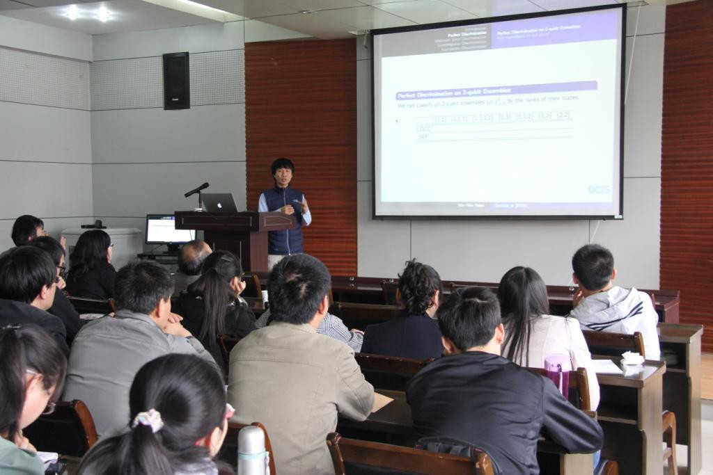 随后,谢明修博士(后)做了题为《Discrimination and a strict Hierarchy in Distinguish ability Norms》的报告。报告中,谢博士回顾了2-qubit态的区分问题,通过局部操作和经典通信(LOCC)显示了带任意小的错误概率的分辨,并且向我介绍了其最新研究结果。