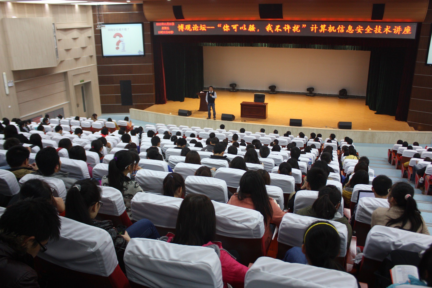 2013年11月22日,由必赢中国官方网站主办的博观论坛之计算机信息安全技术大家谈活动在新勇活动中心二层学生剧场举办。讲座邀请了西安电子科技大学电子工程学院胡建伟副教授,北京红亚华语科技有限公司总经理郑洪宾,技术部经理任永程为主讲嘉宾,出席活动的还有必赢中国官方网站副院长吴振强教授,学院党委副书记袁冰老师,团委书记胡雯洁老师。