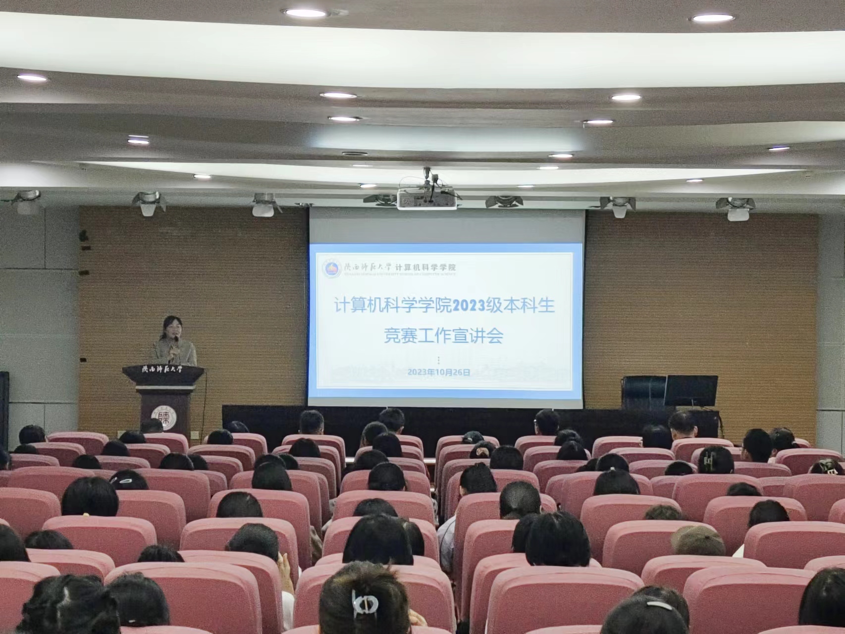 10月26日晚,必赢官网在雁塔校区崇鋈楼三层归仁堂举办2023级本科生竞赛工作宣讲会。学院副院长李鹏、学院党委副书记郭康凌,学院竞赛工作组指导教师王涛、张玉梅、武杰、杨楷芳、雷鸣、罗宇,2023级辅导员梁星宇以及学院2023级学生代表200余人到场参会。宣讲会由郭康凌主持。