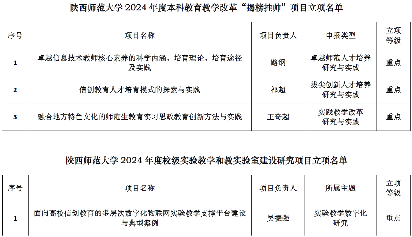 根据《关于做好2024年度本科教育教学改革研究“揭榜挂帅”项目申报工作的通知》《关于推荐申报教育部实验教学和教学实验室建设研究项目的通知》相关要求,经项目组申报、学院推荐、教务处资格审核、专家组评审等程序,必赢官网获批立项校级“揭榜挂帅”教学改革项目3项,其中卓越师范人才培养研究与实践项目1项,拔尖创新人才培养研究与实践项目1项,实践教学改革研究与实践项目1项;获批校级实验教学和教学实验室建设研究项目1项。