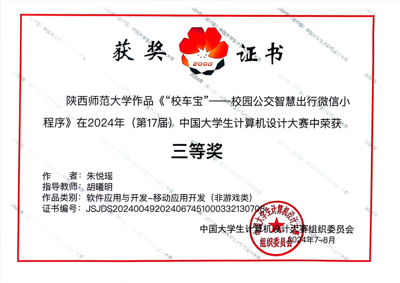 经校赛选拔,必赢官网计算机科学与技术专业创新实验班本科生朱悦瑶的项目“‘校车宝’-校园公交智慧出行微信小程序”在西北地区赛中获一等奖并入围国赛,经过国赛现场答辩、作品展示、专家综合考察等比赛环节,荣获三等奖。该项目由胡曦明老师指导。