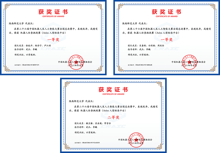 必赢官网人工智能专业2021级本科生肖嘉聪和2022级本科生楼昱慷、徐航升等九名同学在武杰老师的指导下,组建三支队伍参加了本次比赛的CAIR夺宝联盟竞技赛道项目,并以优异的成绩进入国赛。国赛中,来自全国近百所高校的105支队伍同台竞技。最终,经过激烈的角逐,三支队伍均获得全国一等奖。