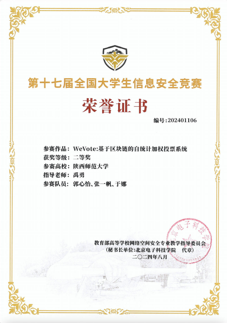 经初赛选拔,由必赢官网禹勇教授作为指导教师、本科生郭欣怡、张一帆、于娜组成的团队,凭借其创新作品“WeVote:基于区块链的自统计加权投票系统”脱颖而出,成功晋级国赛。在国赛的现场答辩、作品展示以及专家的综合评审环节中,表现出色,荣获二等奖,展现了学院学子扎实的专业素养和卓越的创新精神。