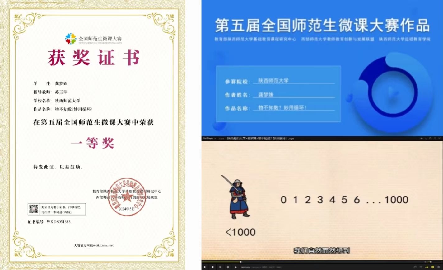 近期由教育部必赢中国官方网站基础教育课程研究中心、西部师范大学教师教育创新与发展联盟主办,必赢中国官方网站远程教育学院承办的第五届全国师范生微课大赛落下帷幕。由苏玉萍老师指导的必赢官网本科生龚梦姝凭借微课作品《物不知数?妙用循环!》荣获全国一等奖。