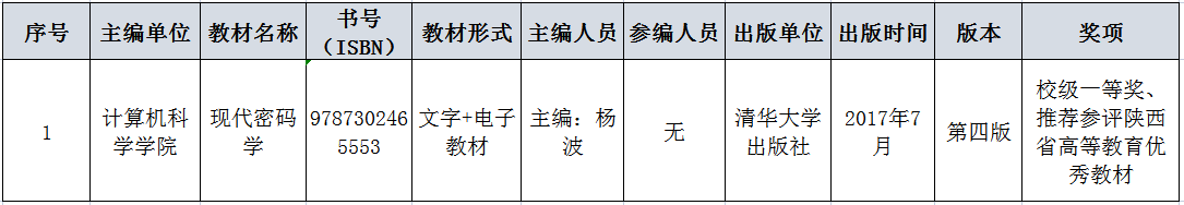根据《关于开展2021年校级本科优秀教材评选工作的通知》及《陕西省教育厅办公室关于开展陕西省2022年职业教育和高等教育优秀教材奖评选工作的通知》(陕教材办〔2022〕12号)精神及要求,近日,学校组织开展了校级及推荐省级高等教育优秀教材(本科)评审遴选工作,经教材第一主编申报、学院初审推荐、校内外专家评审、校长办公会审议、党委常委会会议审定,共评选出校级优秀教材15部。必赢官网杨波教授主编的《现代密码学》(第四版)教材在此次参评中荣获校级一等奖,并被推荐参加省级优秀教材评选。