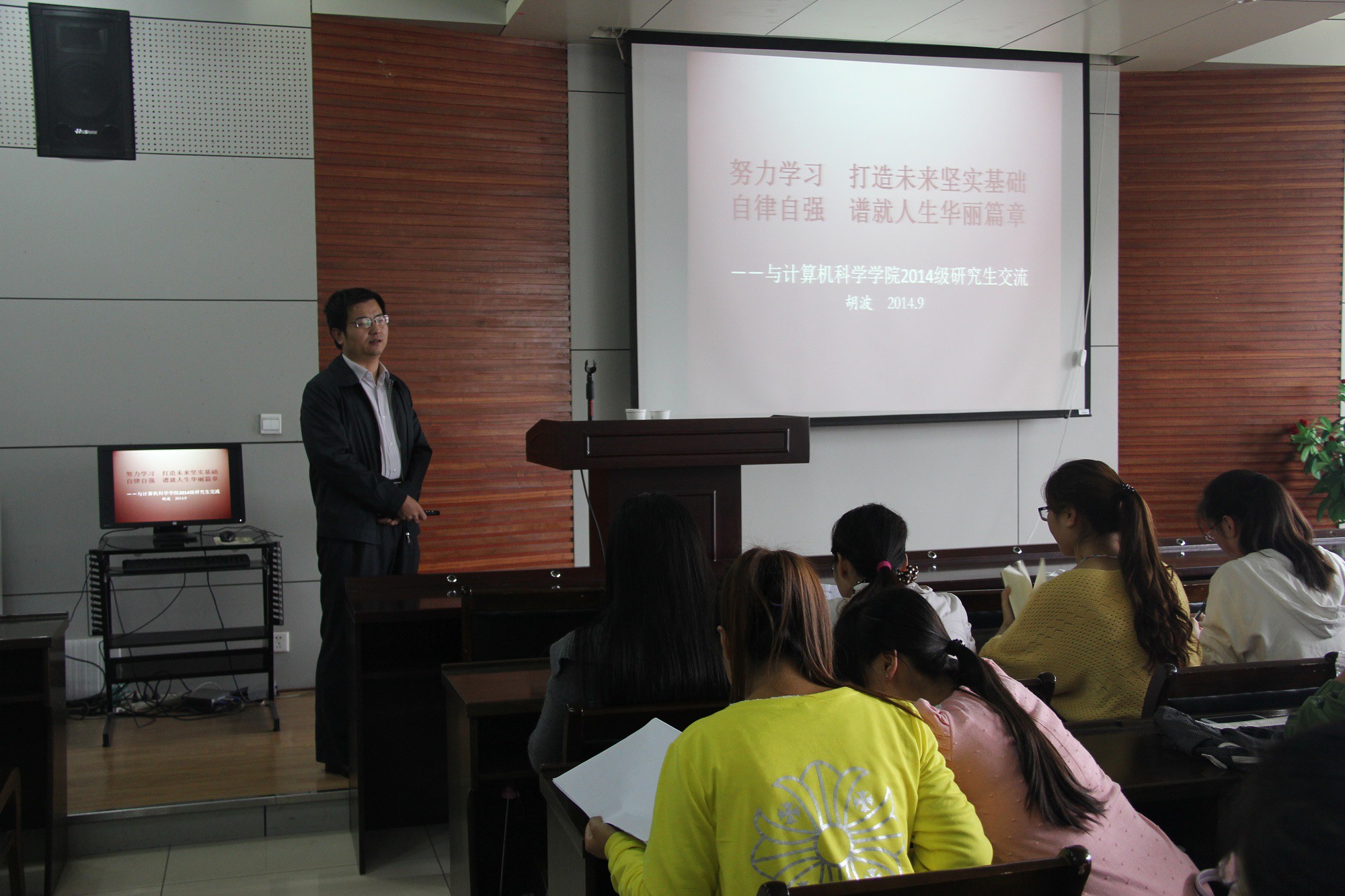 9月16日下午3点,必赢官网2014年研究生新生入学教育报告继续举行。计科院党委书记胡波老师做了题为“努力学习,打造未来坚实基础;自律自强,谱就人生华丽篇章”的报告。报告中,胡波老师从何为研究生,研究生与本科生的区别,学习成本,学习榜样几个角度向新一级研究生介绍了读研的主要目标,研究生期间的学习之道,以及读研期间所需的付出,并鼓励同学们以施一公等知名人物为榜样,心怀远大目标,保持恒心。
