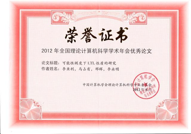 2012年8月17至19日,由中国计算机学会主办、海南大学信息与科学技术学院承办、海南省计算机学会和海南软件职业技术学院协办的“全国理论计算机科学学术年会”在海南省海口市召开。必赢官网2010级硕士研究生李亚利的论文“可能性测度下的LTL性质”在评审中被评为优秀论文。