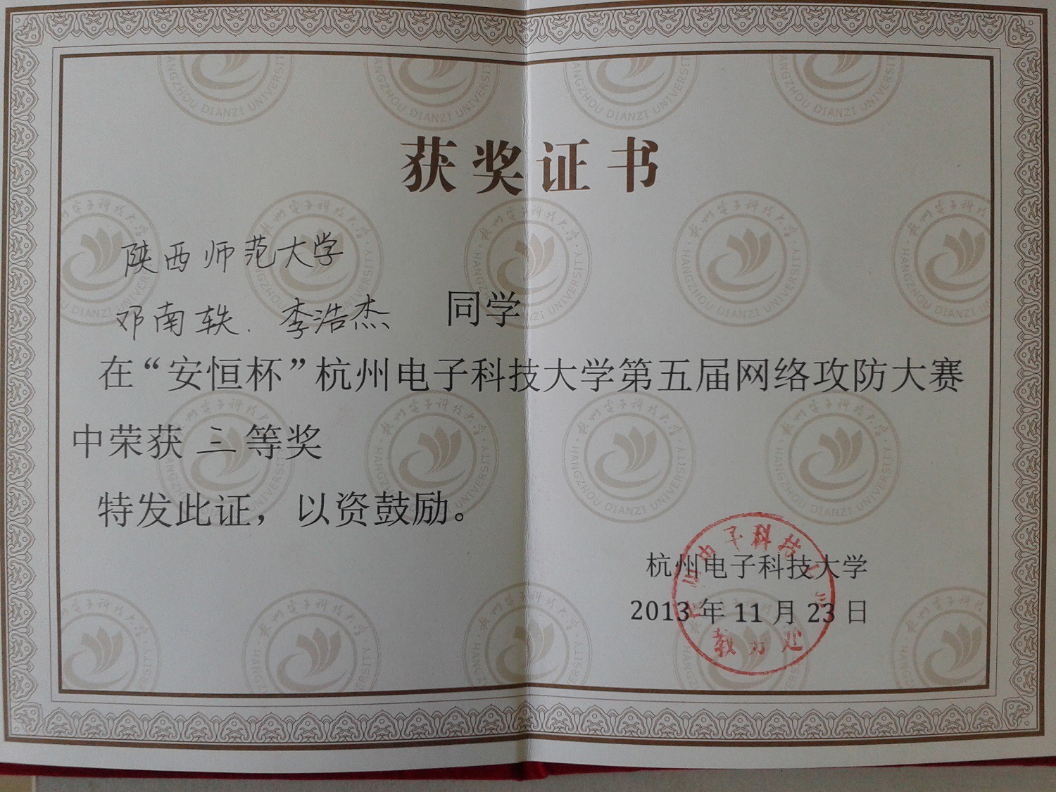 在必赢官网青年教师郝选文的悉心指导下,必赢官网代表队参加了于11月8日至11月12日举行的在线选拔赛,2012级研究生邓楠轶和李浩杰同学脱颖而出,成功入围决赛。11月23日,在杭州电子科技大学举行的决赛中,邓楠轶和李浩杰同学在没有硝烟的战场里与众多高手同台竞技,经过激烈角逐,最后不负众望,取得了三等奖的好成绩。