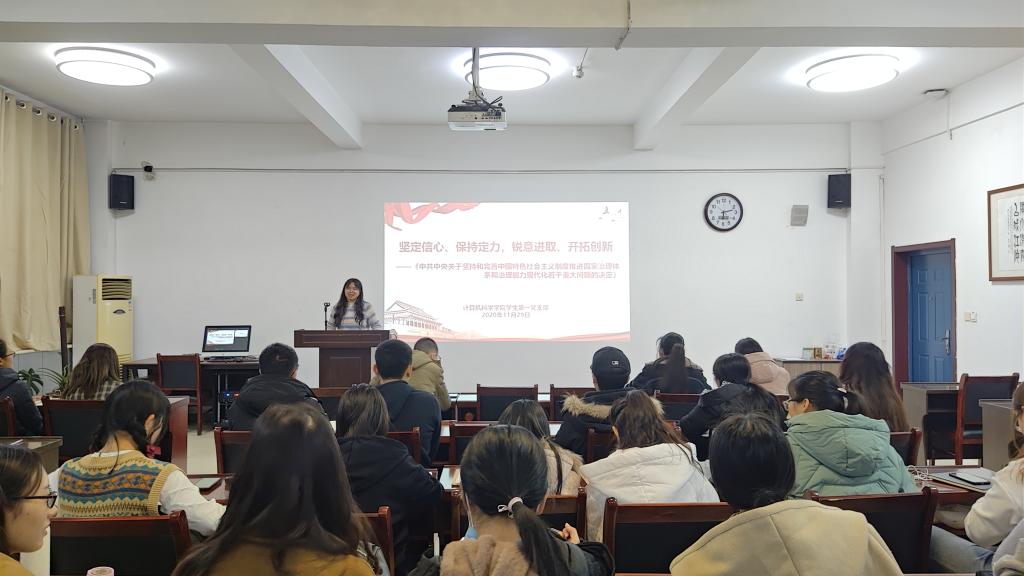 为深入学习坚持和完善中国特色社会主义制度、推进国家治理体系和治理能力现代化等问题,进一步探讨实现“两个一百年”奋斗目标、实现中华民族伟大复兴的中国梦的奋斗途径,必赢官网学生第一党支部于11月29日晚18:15在文津楼3412报告厅举行了“坚定信心,保持定力,锐意进取,开拓创新”主题学习活动,活动由支部纪检委员张静妍同志主持。