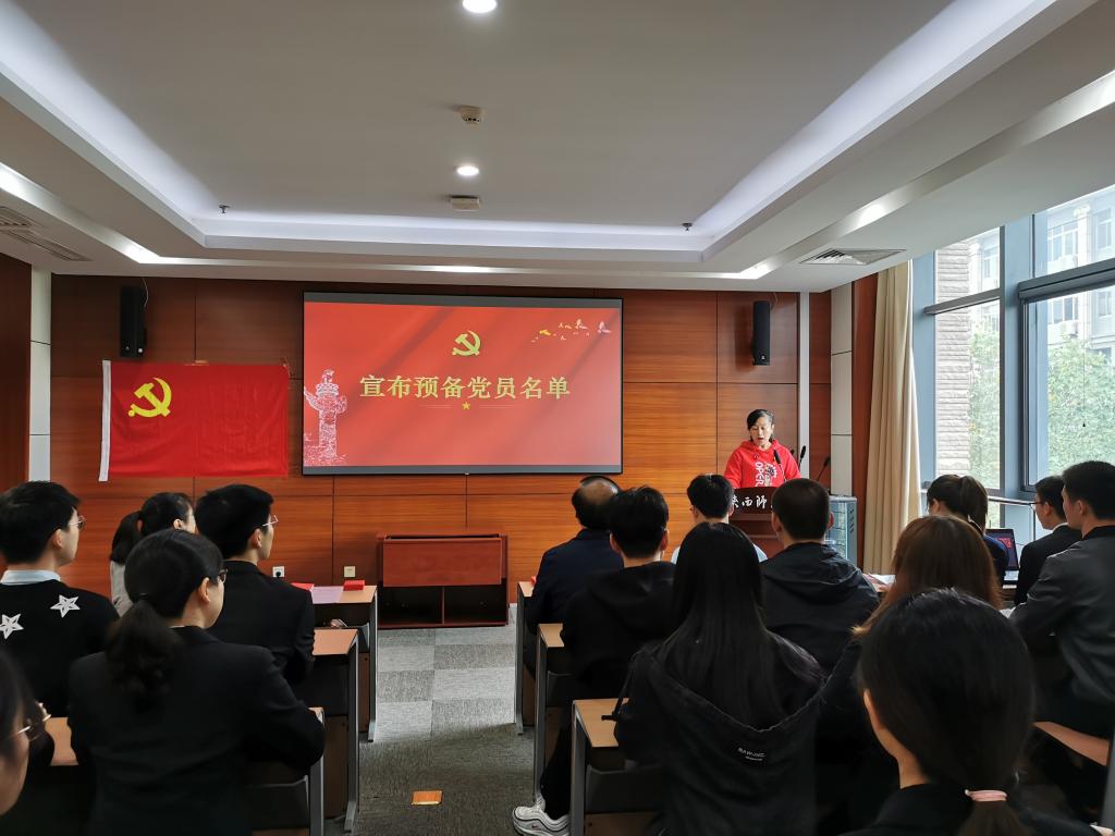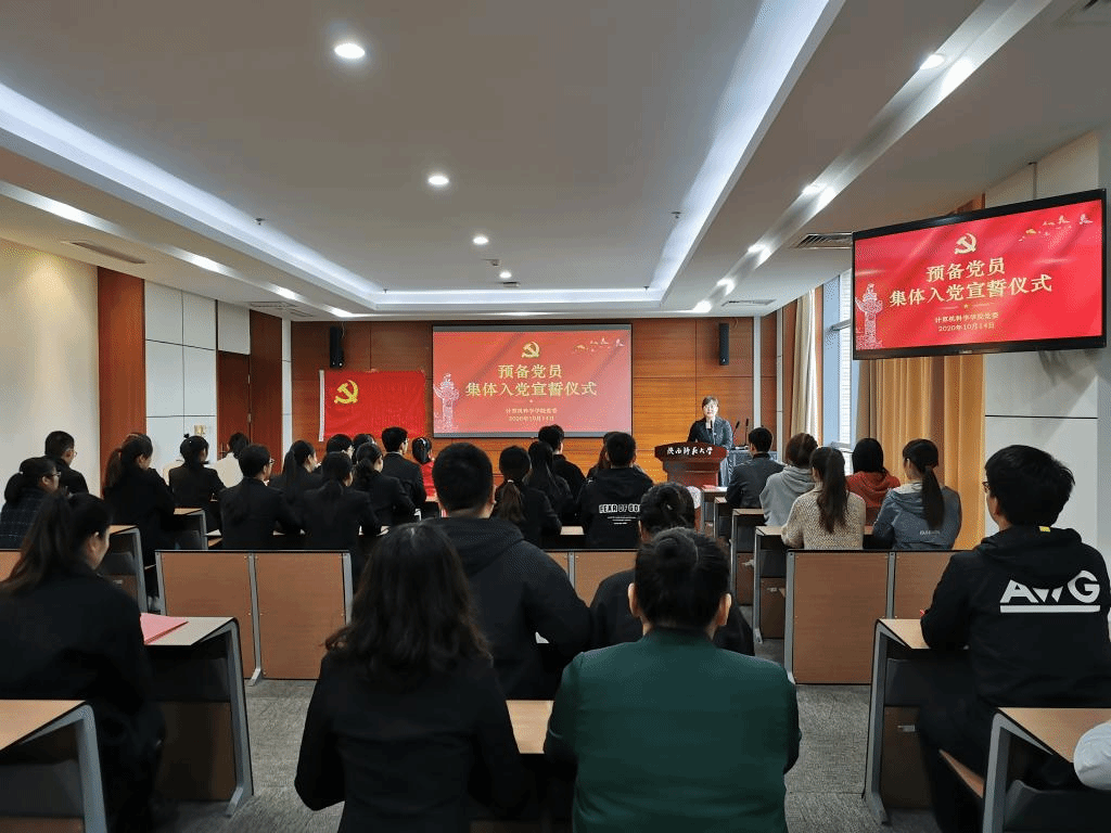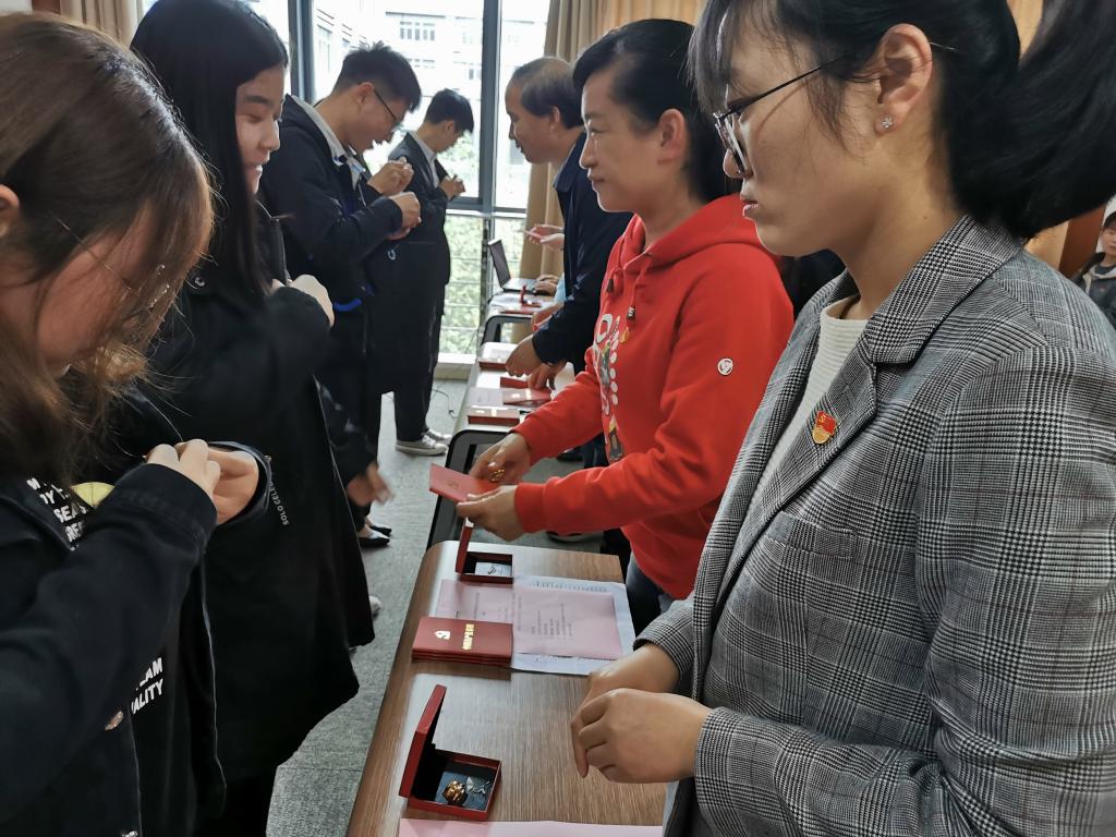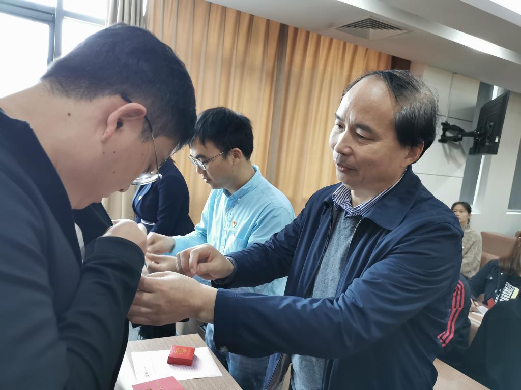 入党宣誓仪式在《国际歌》庄严雄壮的旋律中开始,全体参会人员起立肃穆。袁冰同志宣读了参加宣誓仪式的新党员名单。研究生2019级支部组织委员苟元帅同志担任领誓人,带领全体党员面向党旗郑重宣誓。学院党委委员、党支部书记为预备党员佩戴党徽、赠送党章。