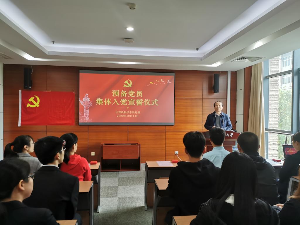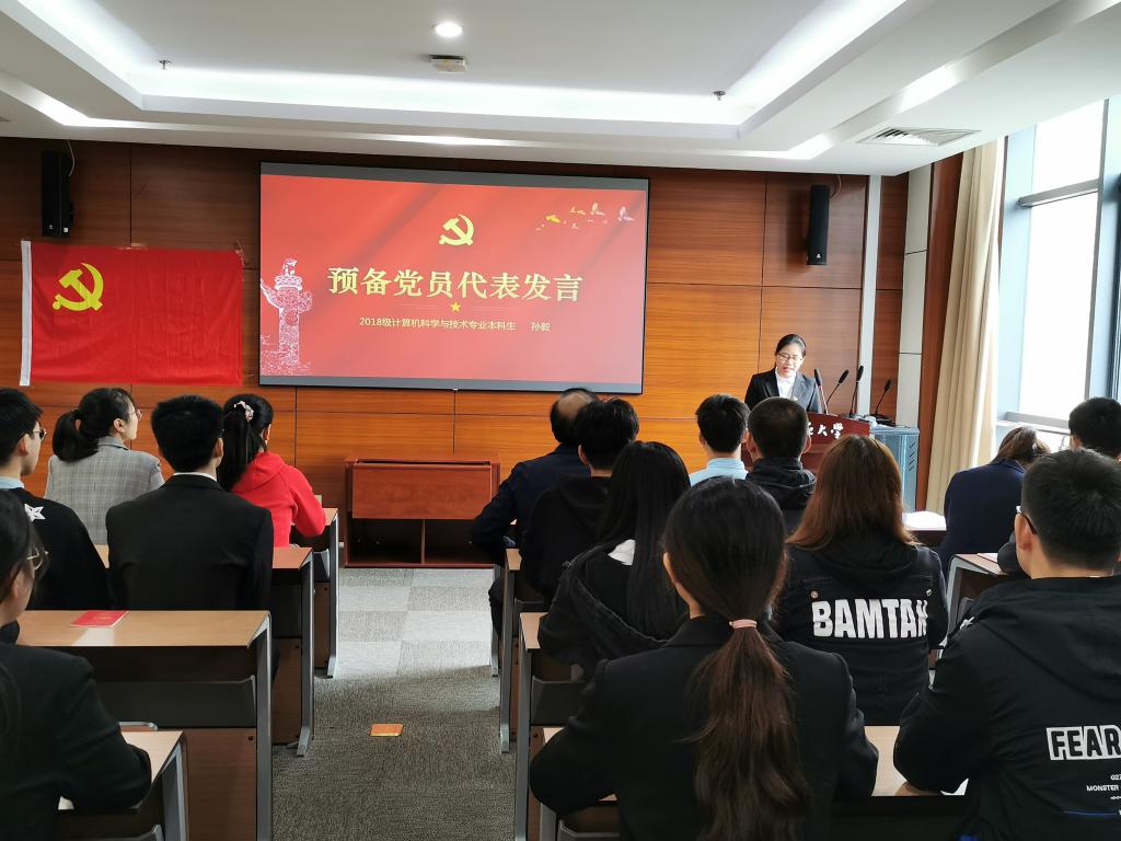 预备党员代表、2018级计算机科学与技术专业本科生孙毅同志发言。她表示,加入党组织,仅仅是一个共产党员万里长征迈出的第一步,一定会永远铭记面向党旗宣誓的这一刻,永远记住向党和人民许下的郑重承诺,把入党誓词作为终身追求、终身修养和终身实践。