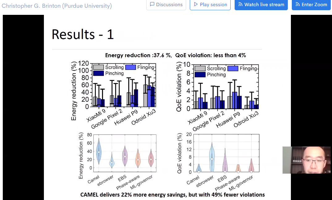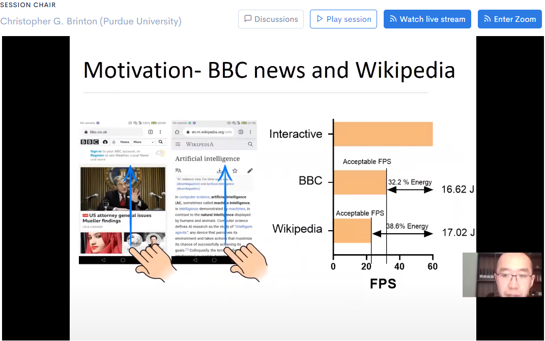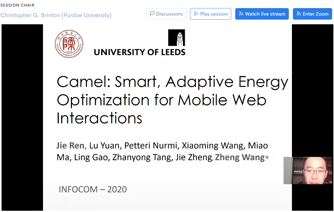 必赢中国官方网站青年教师任杰博士为第一作者,与西北大学、芬兰赫尔辛基大学和英国利兹大学的研究人员合作完成的研究成果“Camel: Smart, Adaptive Energy Optimization for Mobile Web Interactions”,在国际电气和电子工程师协会(IEEE)主办的计算机网络国际顶级学术会议INFOCOM 2020以长文形式发表,也是我校计算机领域的研究论文首次在国际顶级学术会议发表。由于新冠肺炎疫情原因,该会议于2020年7月7日在线上召开,任杰博士在大会上做了视频报告。
