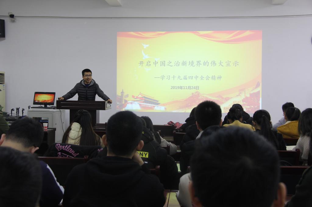 宣传委员冯苗苗:张璐老师的讲解生动形象,深入浅出,从理论内涵、时代背景、文本分析、践行路径等四个方面解读了十九届四中全会的精神内涵,让我们对于时事政治、党的历史有了更进一步的认识。今晚受益颇丰。