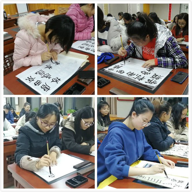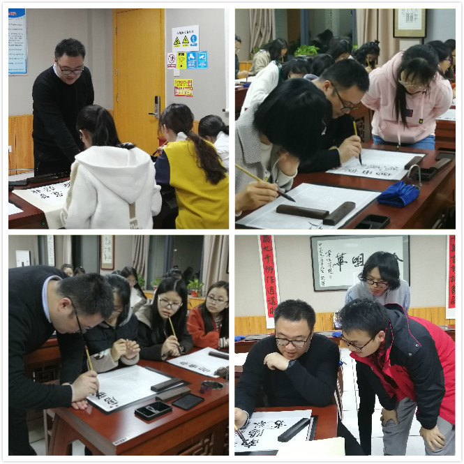 杨国庆老师首先向我们介绍了中国书法中尤为著名的“颜体”。颜真卿早年的书法作品《多宝塔碑》,其风格用笔稳健、雄厚,入笔坚实,行文刚劲,字里行间不乏清晰、深远的特色。后来颜真卿的字体发生了很大的改变,字体笔力雄强圆厚,气势庄严雄浑。欣赏完颜真卿的作品后,杨老师谈到,书法是以文字为载体、通过具有特殊笔情墨韵的汉字形象的创造,表现书法家情感的中国方式,最能体现出中国人的精气神,同学们要主动学习、认真学习。随后,同学们在老师的悉心指导下临摹、练习。