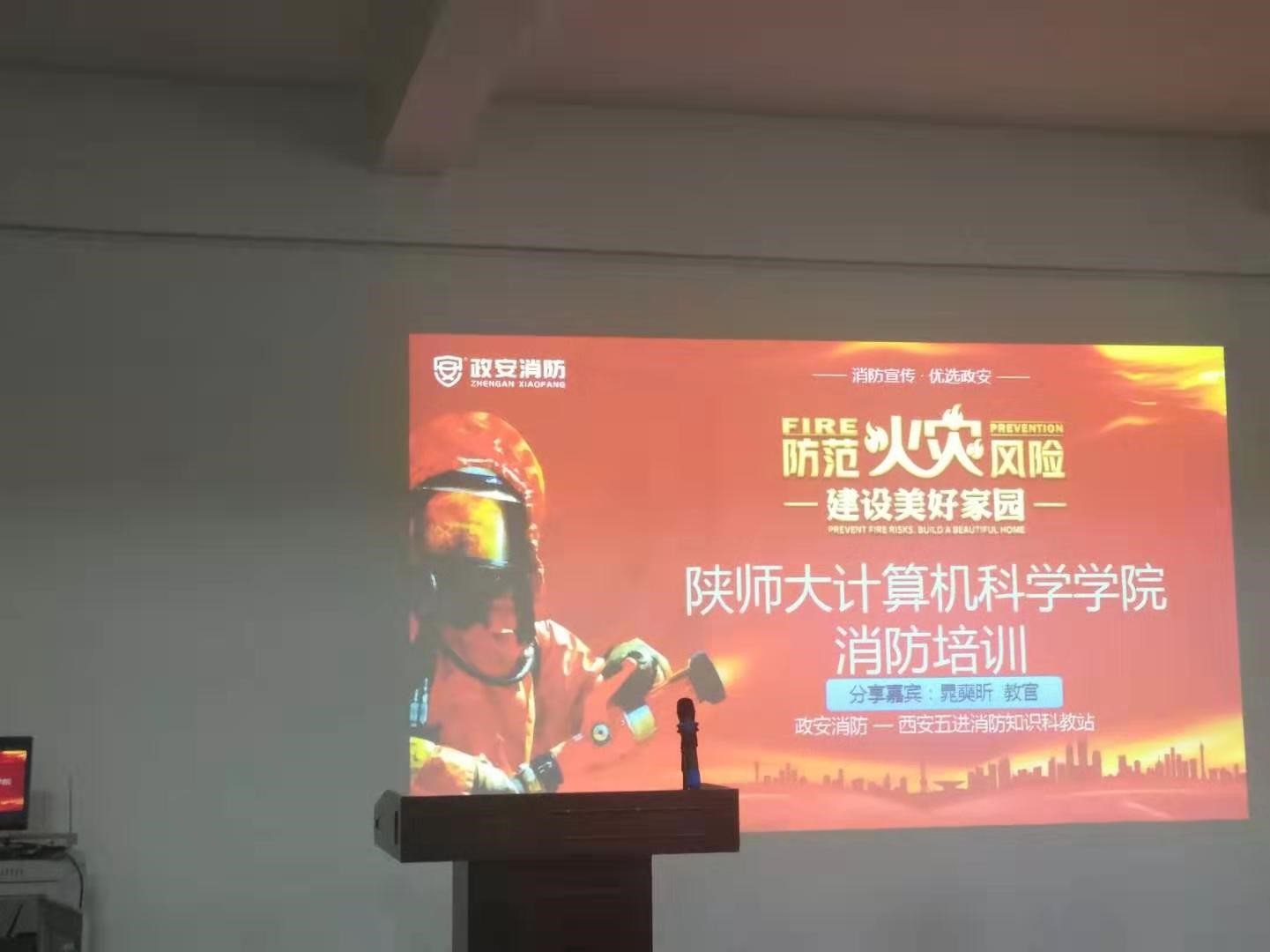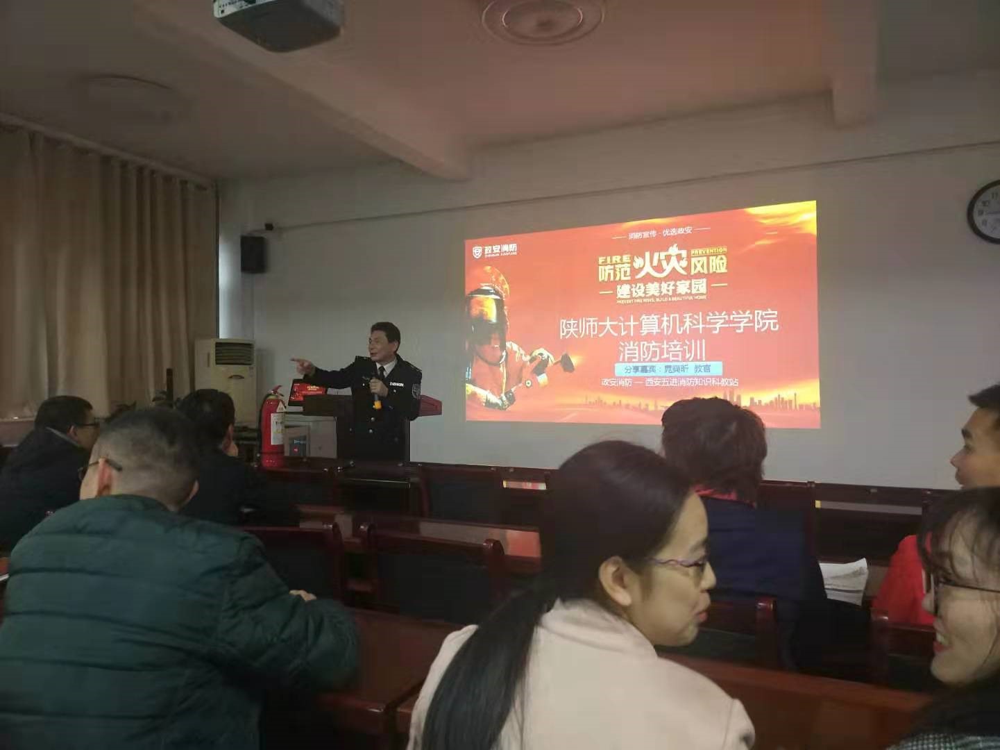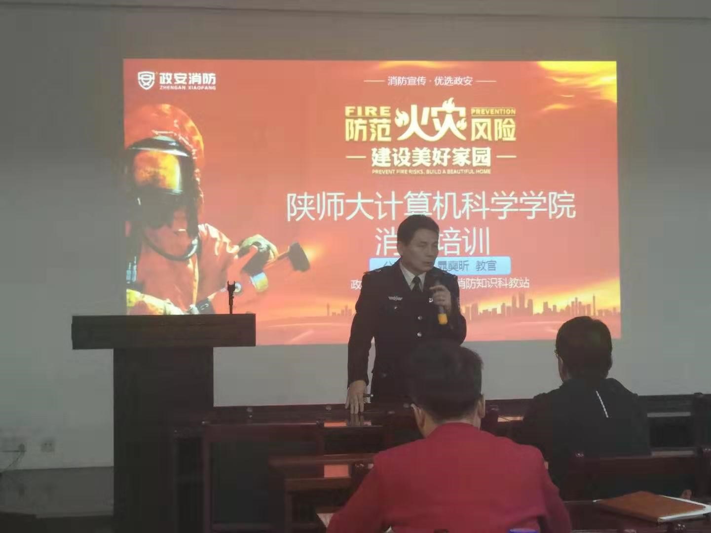 培训有幸邀请到西安市五进消防知识科教站的晁教官作报告,参会人员有教师,教工行政支部党员、实验室人员、行政人员、部分研究生及本科生。培训会由董春生副院长主持,首先董副院长向在座的各位师生介绍了本次培训的目的,传达了学校近期安全教育活动月暨消防安全宣传月的要求,希望大家借助本次培训,增强消防安全意识,提高应急自救互救能力,预防和减少安全事故发生,接着由晁教官为大家作了一场生动精彩的讲座。