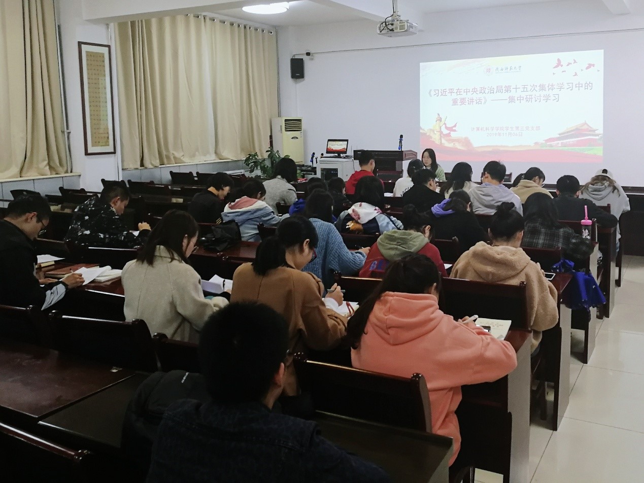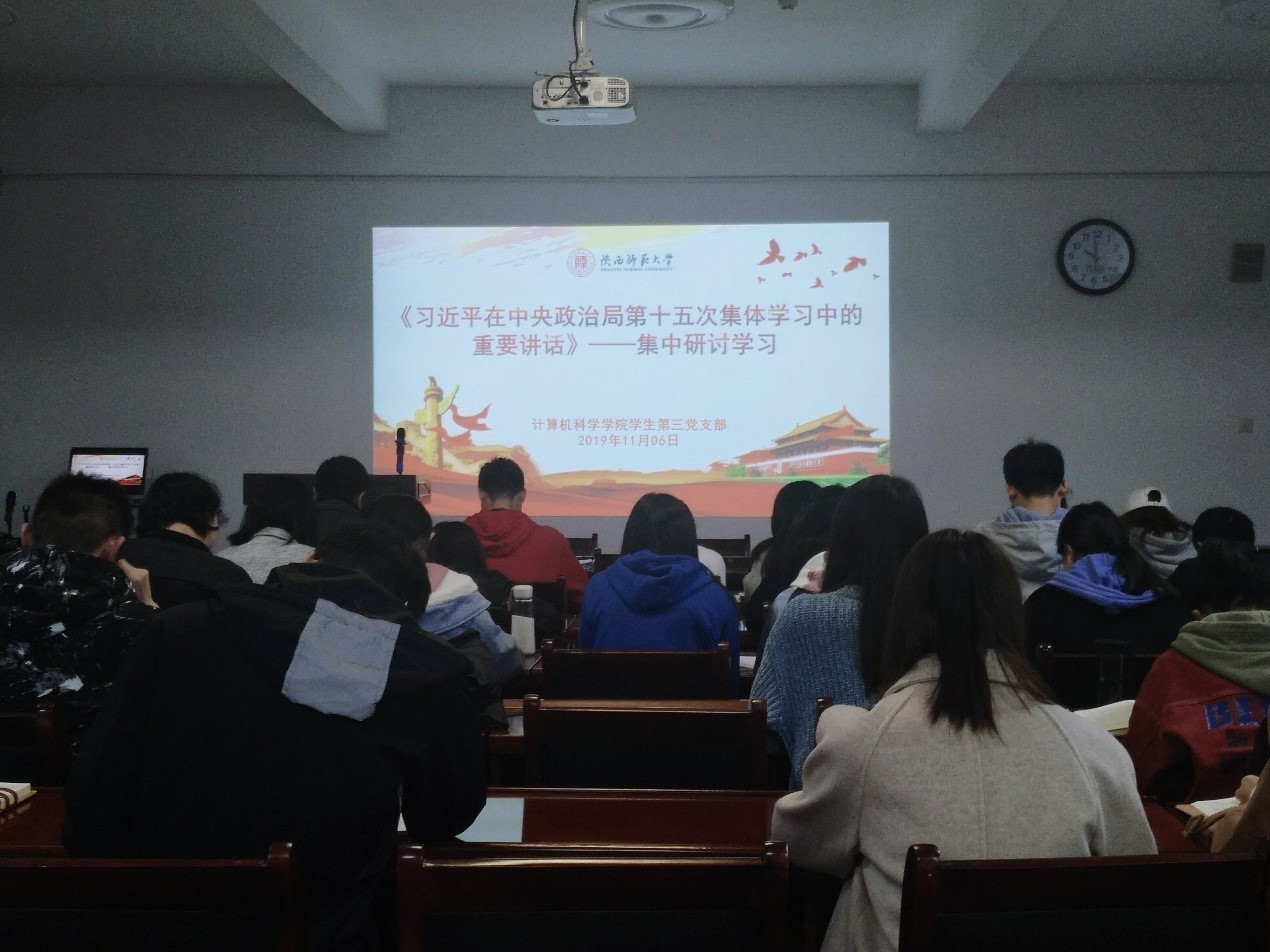 党课之后,支部党员集体研讨学习了《习近平在中央政治局第十五次集体学习中的重要讲话》,该讲话是深入推进主题教育,加强新时代党的建设的行动指南。围绕讲话精神,结合学习体会,支部党员进行了交流分享。支部组织委员苟元帅谈到习近平总书记在主持学习时强调应永葆党的先进性和纯洁性,永葆青春活力,从党员个人层面上来说,应不断学习,与时俱进,提高面对困难和挫折的勇气,增强勇于担当的责任意识;李雪立足自身,表示学习完以后感触很深,习近平总书记的“我将无我、不负人民”的使命担当一直激励着自己,作为一名硕士研究生,我们一定不能忘记来读研究生的初心并要好好完成自己在研究生期间的使命;张凯云同志分享到习近平总书记在讲话中提到的三个如何的问题的解决不仅明确了目标,更是每一位党员在践行不忘初心时需要时刻提醒自己的准则方向,需要我们认真领会并努力践行。