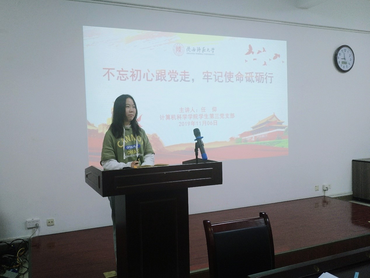 会上,支部书记任仰为全体党员讲授了题为《不忘初心跟党走,牢记使命砥砺行》的党课,她从中国共产党的初心和使命是什么、为什么要“不忘初心、牢记使命”、如何做到“不忘初心、牢记使命”三个部分展开讲解,她提到只有不忘初心牢记使命,才能不断前进,才能精神永驻。结合自身经历,勉励大家要勇担时代重任,做到忠于祖国,忠于人民;明礼诚信,敬业奉献;立鸿鹄志,做奋斗者;求真学问,练真本领;知行合一,做实干家。