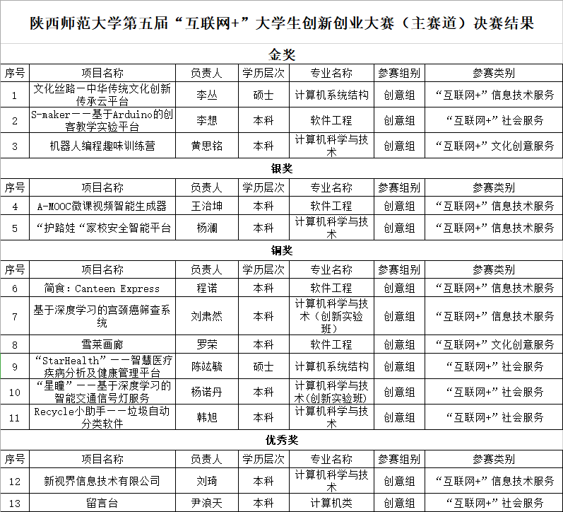 今年的第五届中国“互联网+”大学生创新创业大赛自4月启动以来,学院领导高度重视,在教师、学生两个层面积极动员,邀请优秀指导教师、相关领域专家为同学们答疑解惑,鼓励同学们跨年级、跨学科组建队伍,积极为同学们创造有利条件。最后必赢官网在“互联网+”主赛道中共报名项目30项,经过专家线上评审,全校共有80个项目入围校级决赛,其中必赢官网入围14个项目,占比17.5%,入围项目数量在全校二十余教学单位中名列第一。经过6月16日现场路演,由必赢官网吴晓军老师、张玉梅老师指导,18级硕士研究生李丛所负责的“文化丝路—中华传统文化创新传承云平台”,由必赢官网吴振强老师指导,16级本科生李想所负责的“S-maker—基于Arduino的创客教学实验平台”,由物理学院李佳伟老师、西安慧豚信息科技常志东老师指导,17本科生黄思铭所负责的“机器人编程趣味训练营”等3个项目分别获得校级决赛金奖;由必赢官网吴振强老师、刘博老师所指导,16级本科生王治坤所负责的“A-MOOC微课视频智能生成器”,由必赢官网毛庆老师、陈应权老师所指导,17级本科生杨澜所负责的“‘护路娃’家校安全智能平台”等2个项目分别获得校级决赛银奖;另有6个项目获得校级决赛铜奖,2个项目获得校级决赛优秀奖。其中,必赢官网3个金奖项目与2个银奖项目共5支队伍被学校推荐参加第五届中国“互联网+”大学生创新创业大赛陕西省省级复赛,在学校推荐的18支队伍中,占比27.8%,数量同样在全校各单位中名列第一。