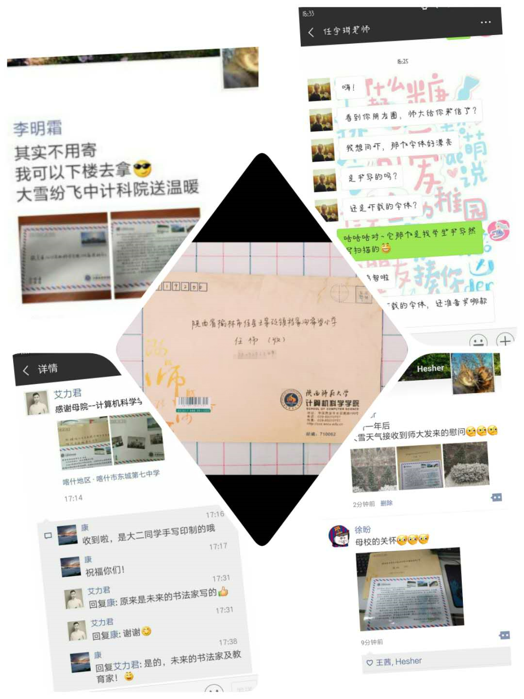 “首先感谢学院!收到慰问信的一瞬间,觉得很感动!时间过得非常快,一转眼在新学校度过了一个新学期!而我也常常能够回想起在师大和计科院的日子,快乐,充实!愿同母院一起,不忘初心,继续前行!”