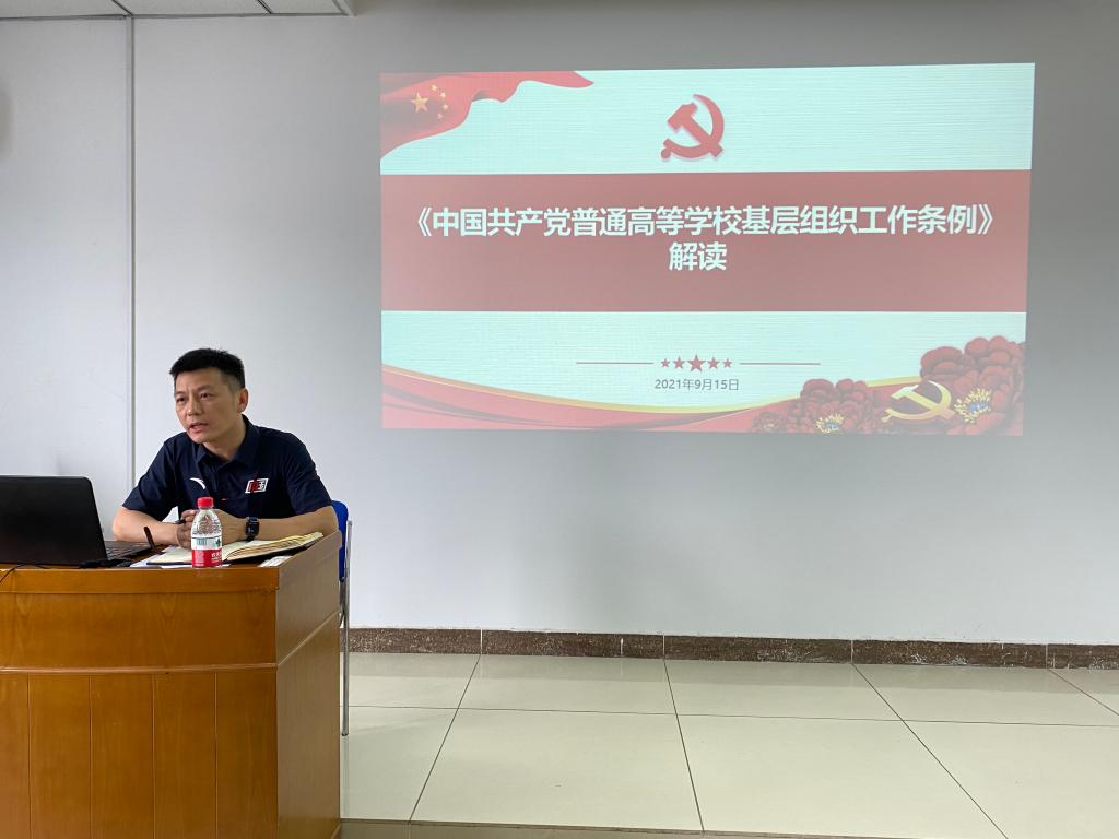 王耀明同志首先传达了学校二级党委书记工作例会精神,并领学了《中国共产党普通高等学校基层组织工作条例》。他分析了中国共产党依法依规治党思想的确立完善的过程和《条例》在党的制度体系中的作用和地位,阐述了中国共产党基层组织发展演变历程和《条例》的具体内容。