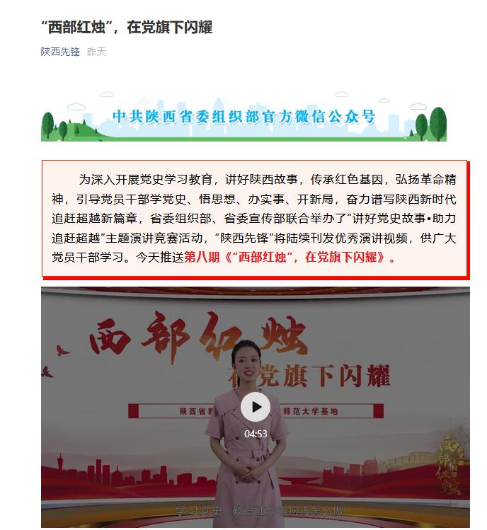 近日,由陕西省委组织部、省委宣传部联合举办的“讲好党史故事·助力追赶超越”主题演讲竞赛活动顺利开展。由陕西省干部教育培训必赢中国官方网站基地选送、必赢官网2019级本科生辅导员崔瑜璠主讲的微党课《“西部红烛”,在党旗下闪耀》作为优秀作品在陕西省委组织部官方微信公众号“陕西先锋”从做了专题展播。