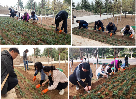 在后勤师傅的指导下,老师和同学们很快掌握了种草的过程和要求,迅速投入到种植作业中。挥锄挖土、种草培土,同志们分工合作、配合默契,认真细致地种好每一颗小草,做到了劲往一处使,汗往一处流,用心诠释着对大自然生命的关爱,整个活动现场热火朝天。大家沐浴在春光里,边劳动边交流,呼吸着花草的清香,体会着劳动的快乐,以实际行动践行绿色发展理念。不知不觉一个多小时过去了,看着一排排亲手栽种的小草随风起舞,焕发出勃勃生机,成就感在每个人心中油然而生。