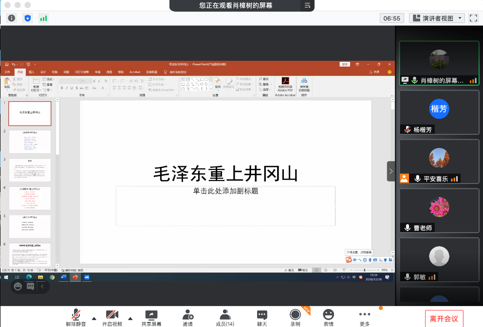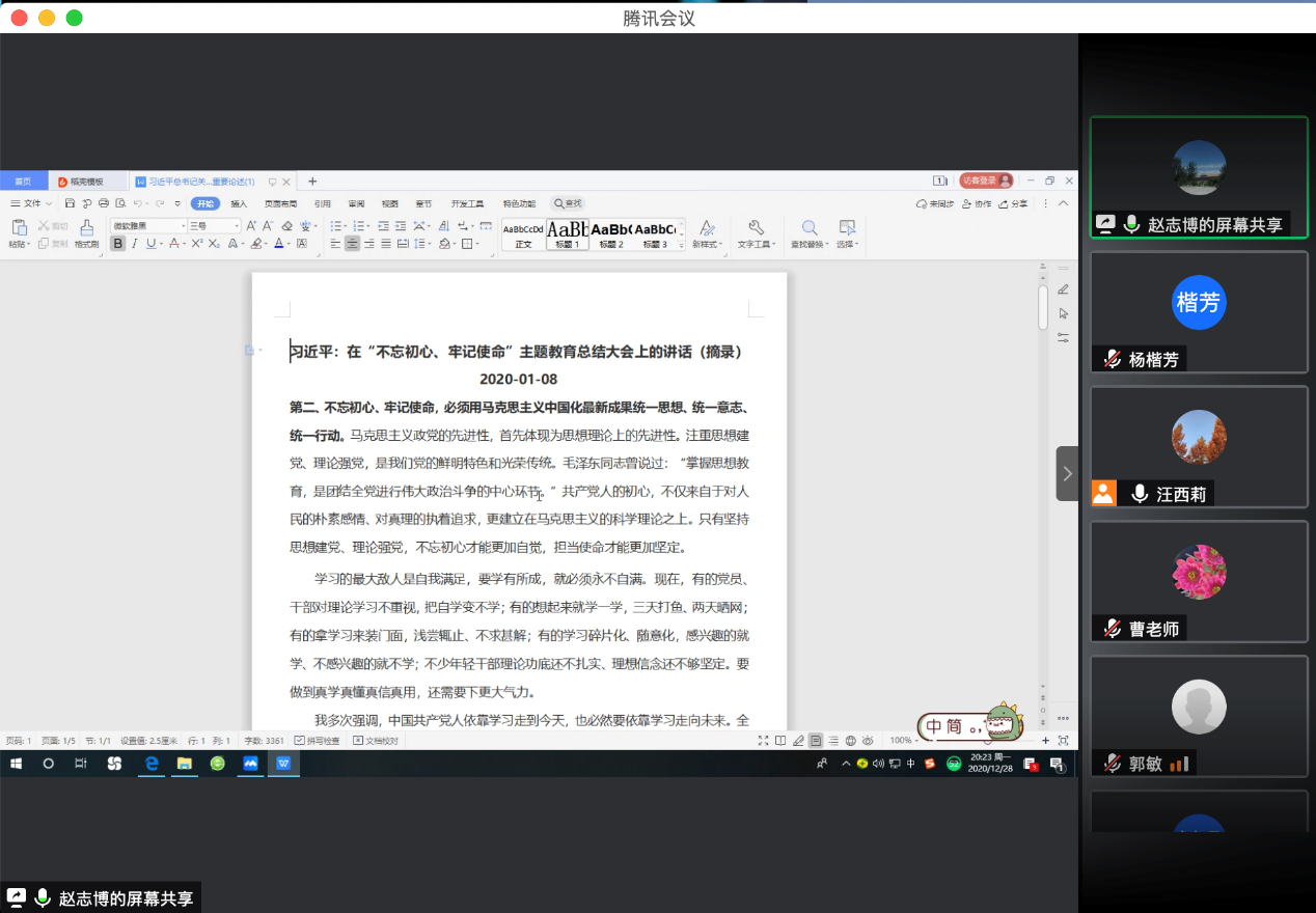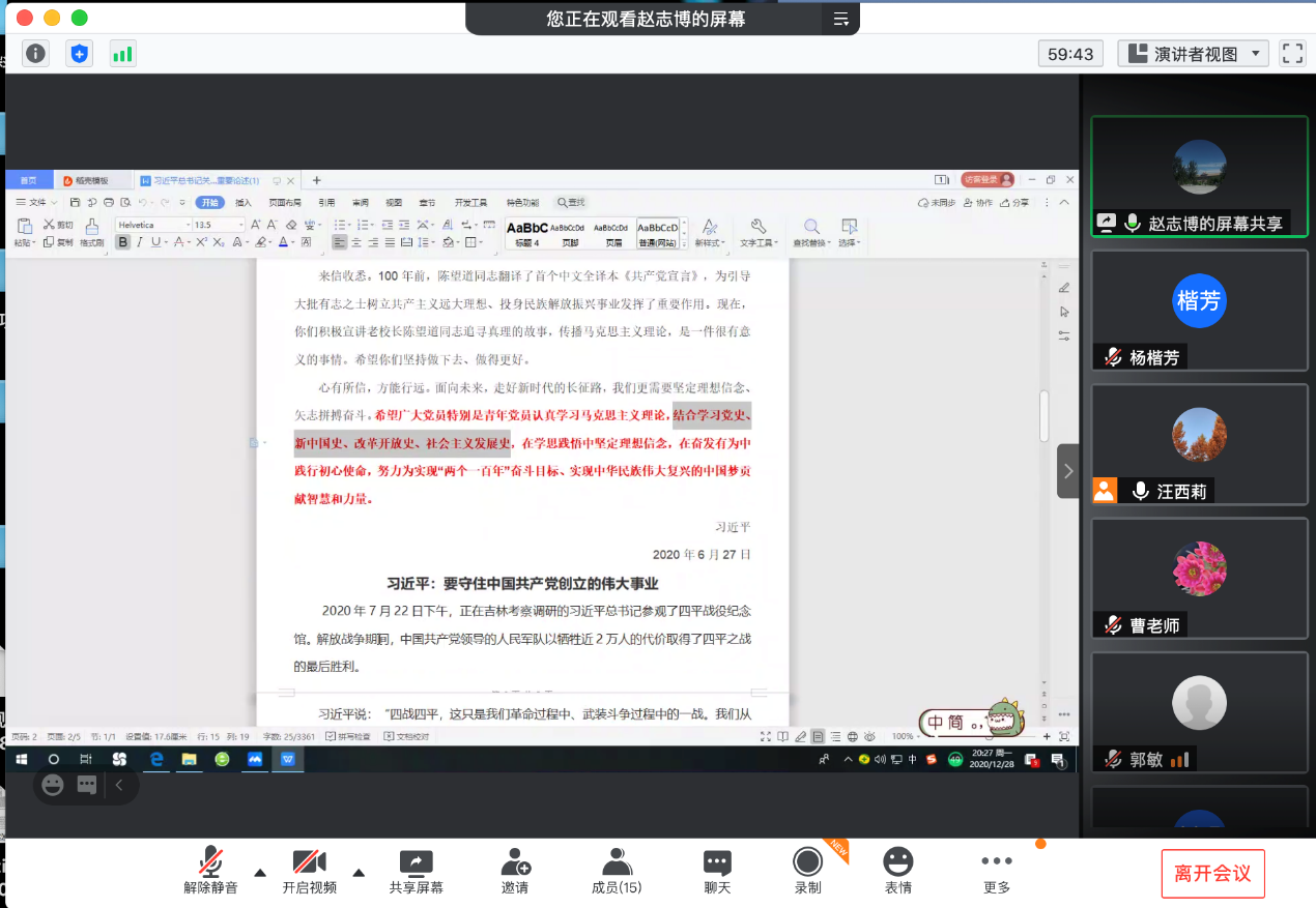 赵志博老师分享了习近平总书记关于“四史”的重要论述。赵老师从习近平总书记在“不忘初心、牢记使命”主题教育总结大会上的讲话、习近平给复旦大学《共产党宣言》展示馆党员志愿服务队全体队员的回信、2020年7月22日在吉林考察调研的习近平总书记参观了四平战役纪念馆时的讲话等介绍了习近平总书记对于学习“四史”的相关要求和具体内容。赵老师从为何学、学什么以及怎么学进行了介绍,要把学习贯彻党的创新理论作为思想武装的重中之重,同学习马克思主义基本原理贯通起来,同学习党史、新中国史、改革开放史、社会主义发展史结合起来,同新时代我们进行伟大斗争、建设伟大工程、推进伟大事业、实现伟大梦想的丰富实践联系起来,在学懂弄通做实上下苦功夫,在解放思想中统一思想,在深化认识中提高认识,切实增强贯彻落实的思想自觉和行动自觉。