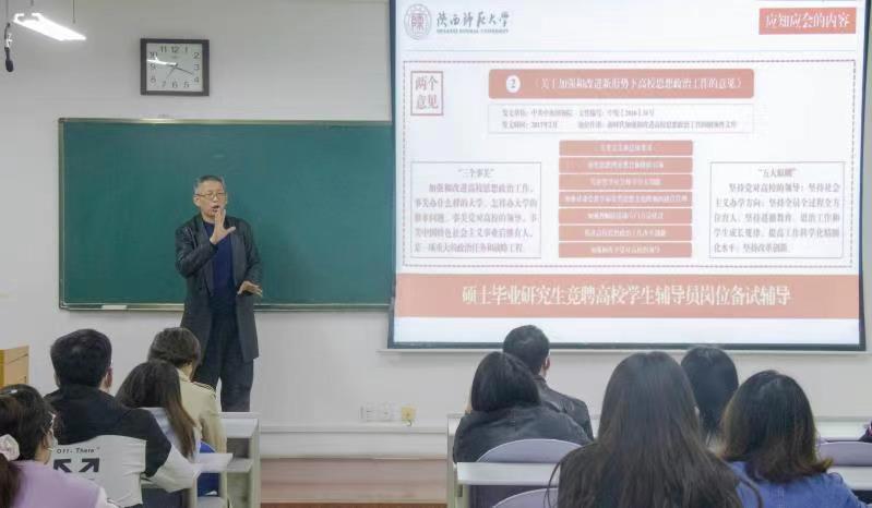 刘建军从辅导员岗位特点、竞聘辅导员应知应会的内容以及有效应试的方法三方面为大家进行了分析讲解。以知名辅导员徐川、曲建武事迹为切入点,刘建军为大家分析了辅导员职业的岗位特点,指出新时代党和国家高度重视高校辅导员队伍建设;在竞聘辅导员应知应会的内容方面,刘建军为大家讲解分析了重要讲话、重要会议、重要文件、重要表述等相关备考内容;最后,刘建军详细讲解了构架知识体系进行人脑编码、结合考试题型实施重点突破、掌握案例分析和谈心谈话答题技巧的有效应试方法,为备试指明清晰的方向和正确的方法。