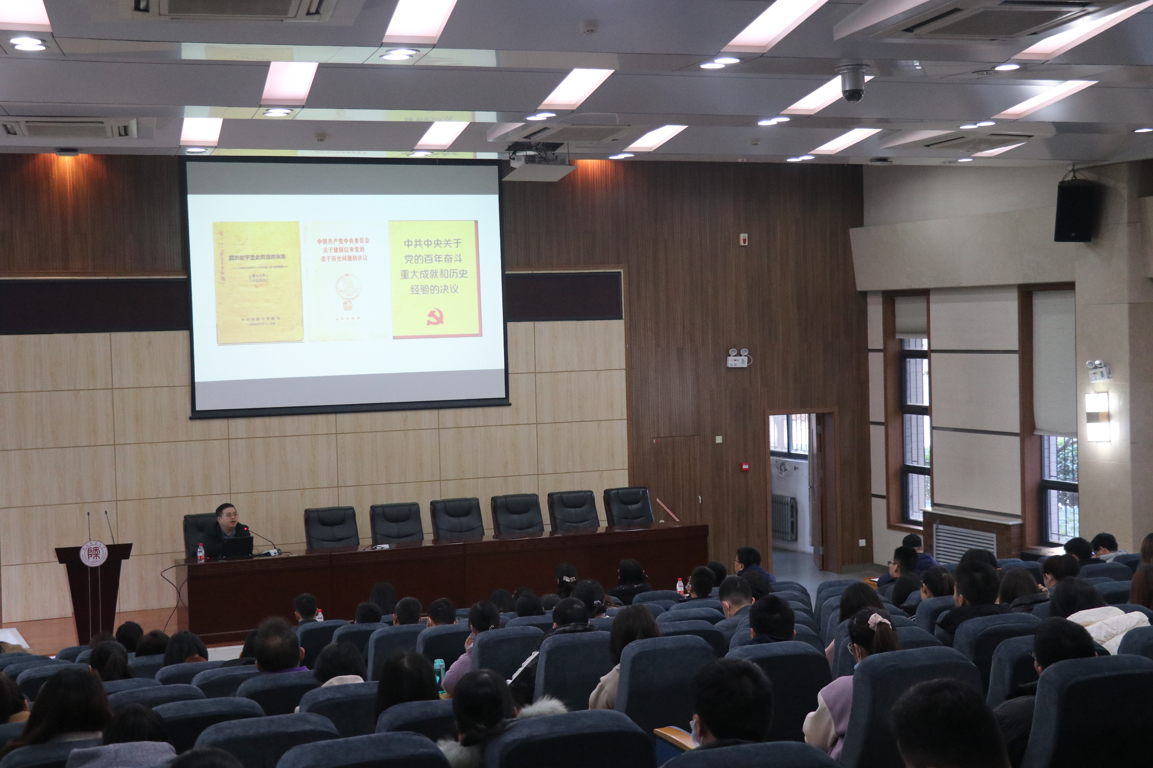 张帆从制定《中共中央关于党的百年奋斗重大成就和历史经验的决议》的必要性开始讲起,讲解了党的百年奋斗史在实现中华民族伟大复兴进程中的科学定位,回答了中国共产党是什么、要干什么的核心问题,阐述了如何理解马克思主义中国化的新飞跃,分析了如何准确把握党百年奋斗历史意义的内在逻辑,引导大家深刻领会“十个坚持”的历史经验。他的讲解生动而又深刻,内容丰富、旁征博引、充满激情,在座师生被深深吸引,掌声热烈。