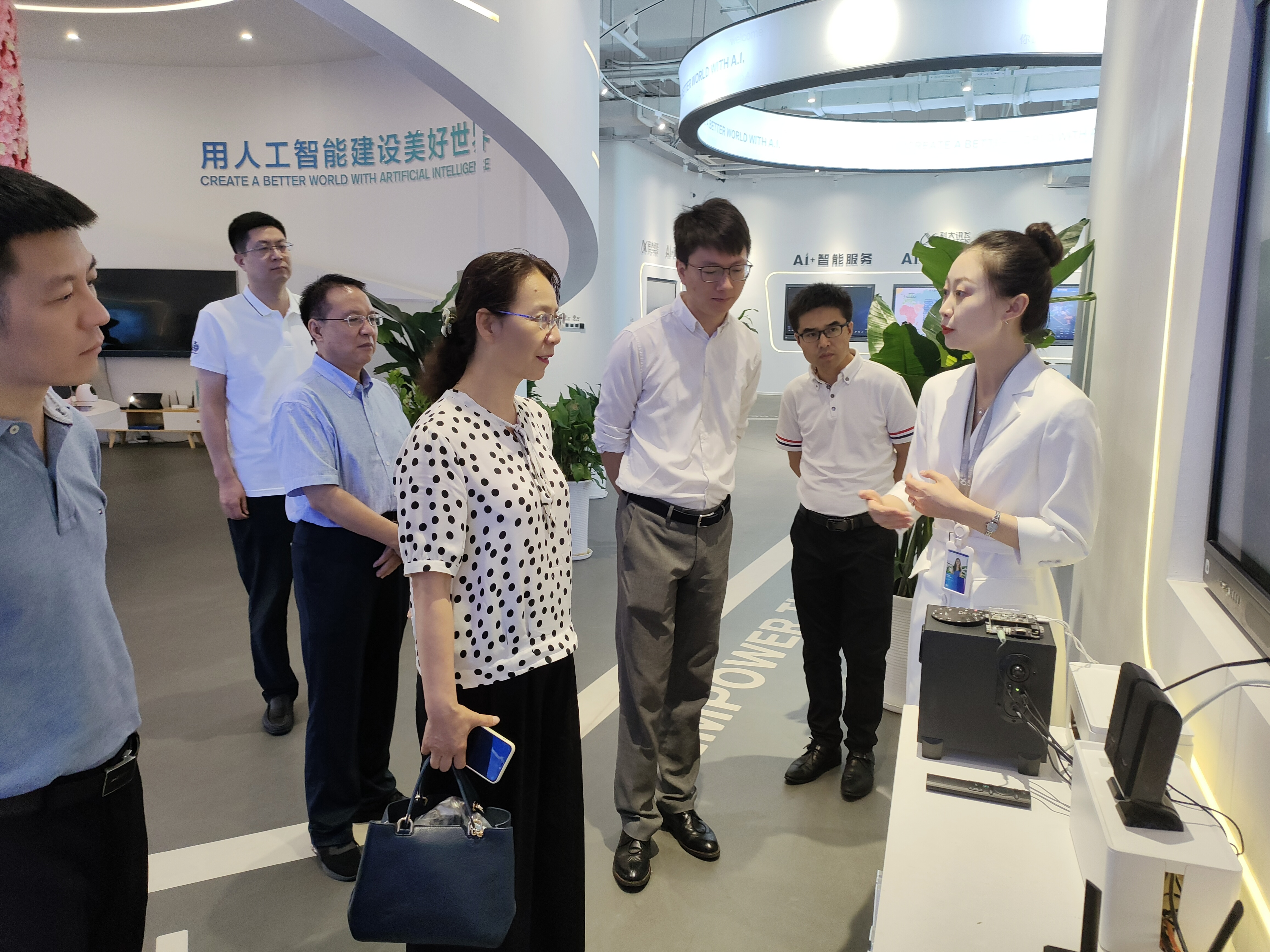 在科大讯飞丝路总部,杨祖培一行参观了人工智能体验馆,双方开展座谈交流,听取企业负责人的情况介绍,了解企业发展现状与规划、岗位设置、人才需求等情况。杨祖培从我校办学特色、学生培养目标、访企拓岗专项行动的重要意义等方面进行了交流。院长王小明介绍了学院专业建设情况、研究方向等。杨祖培表示,希望校企双方能够发挥优势,加强校企合作,促进共同发展。