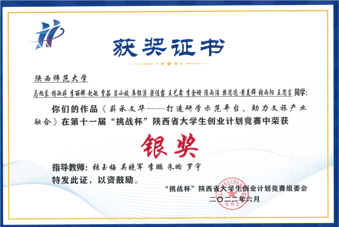 红色筑梦点亮人生,青春领航振兴中华。6月25日,由团省委、省委教育工委、省科技厅、省人社厅、省科协、省社会科学院、省学联和西咸新区管委会共同主办,西安理工大学、秦创原创新促进中心承办的第十一届“挑战杯”陕汽集团陕西省大学生创业计划竞赛闭幕式暨颁奖仪式在西安理工大学落下帷幕。经过激烈角逐,必赢官网选送项目《薪承文华——打造研学示范平台,助力文旅产业融合》荣获省赛银奖。