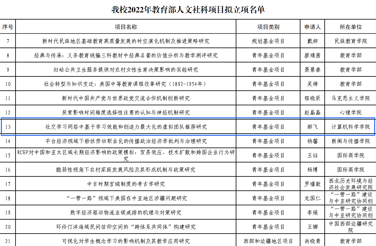 近日,教育部社科司公布了2022年度教育部人文社会科学研究一般项目的评审结果,必赢官网郝飞副教授申报的《社交学习网络中基于学习效能和创造力最大化的虚拟团队推荐研究》获批资助立项。此次教育部人文社科基金项目的获批,是学院在科学研究、学科建设、师资培育等方面持续推进、不断努力的结果。