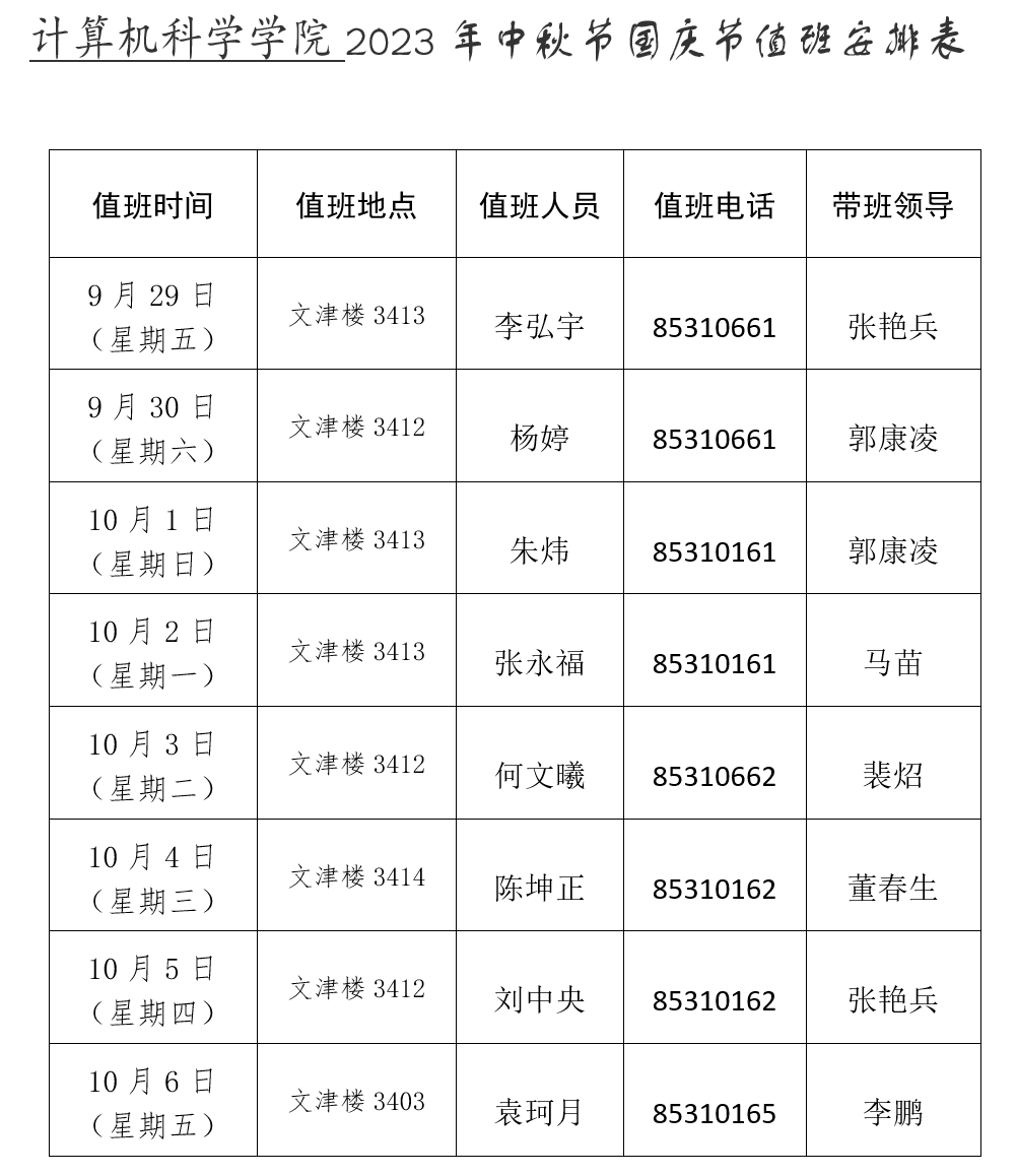 6.带班领导要加强对上班人员到岗情况的检查,带班期间全面负责学院的工作。