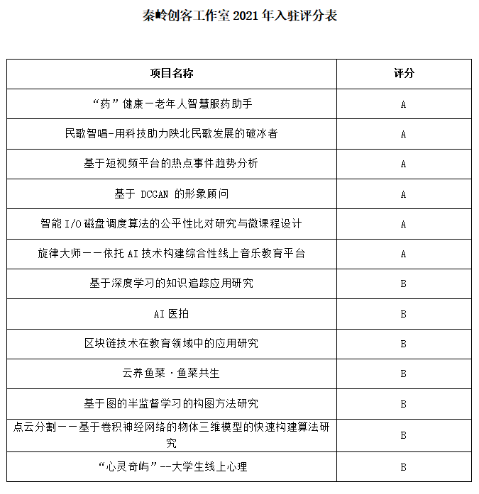 必赢官网于6月23日组织了2021年度秦岭创客工作室入驻项目遴选推荐工作。通过项目组申报答辩、院内专家评审等程序,共遴选出13个项目入驻创客工作室,A类项目6项(入驻文津楼3624),B类项目7项(入驻文津楼4楼创客坊),现将拟推荐项目名单予以公示(详见附表)。推荐项目将于7月5日起入驻秦岭创客工作室,并按照《秦岭创客工作室》入驻指南进行项目培育。