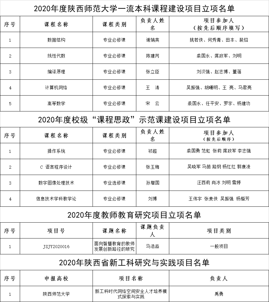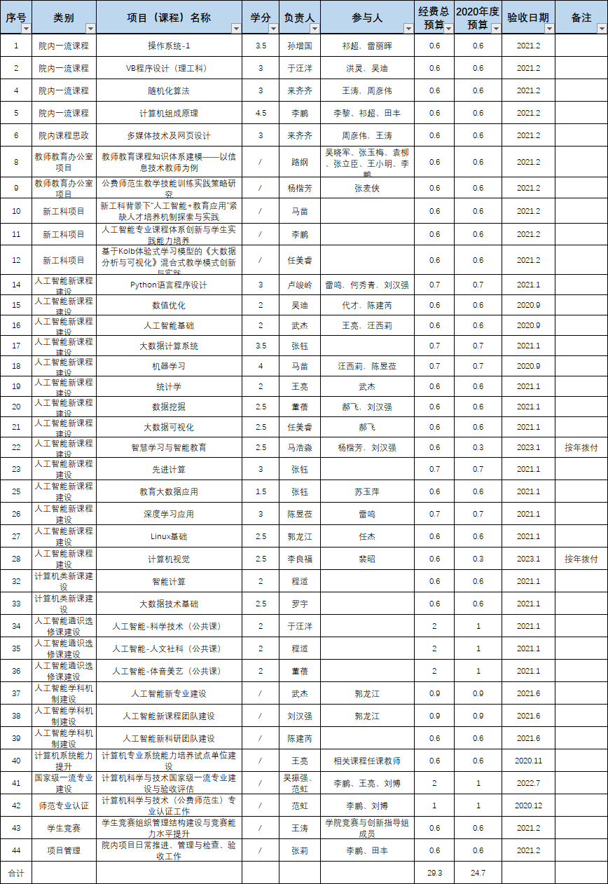 为了切实提高本科教学质量,7月13日经学院党政联席会议研究决定,对今年提交了相关申请未受学校及以上资助的项目和人工智能专业的新课程建设项目以及其他类项目开展院内资助与建设,拟立项清单如下表所示。请相关负责人和参研人员明确建设目标,签订任课责任书,扎实开展教研,按时提交中期报告(2020年秋季学期末)和结题报告(日期见详表),保质保量完成预定任务目标。