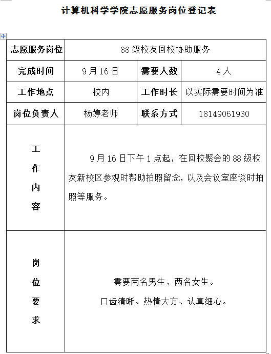 志愿服务岗位信息(9月16日)——必赢官网88级校友回校协助后勤服务