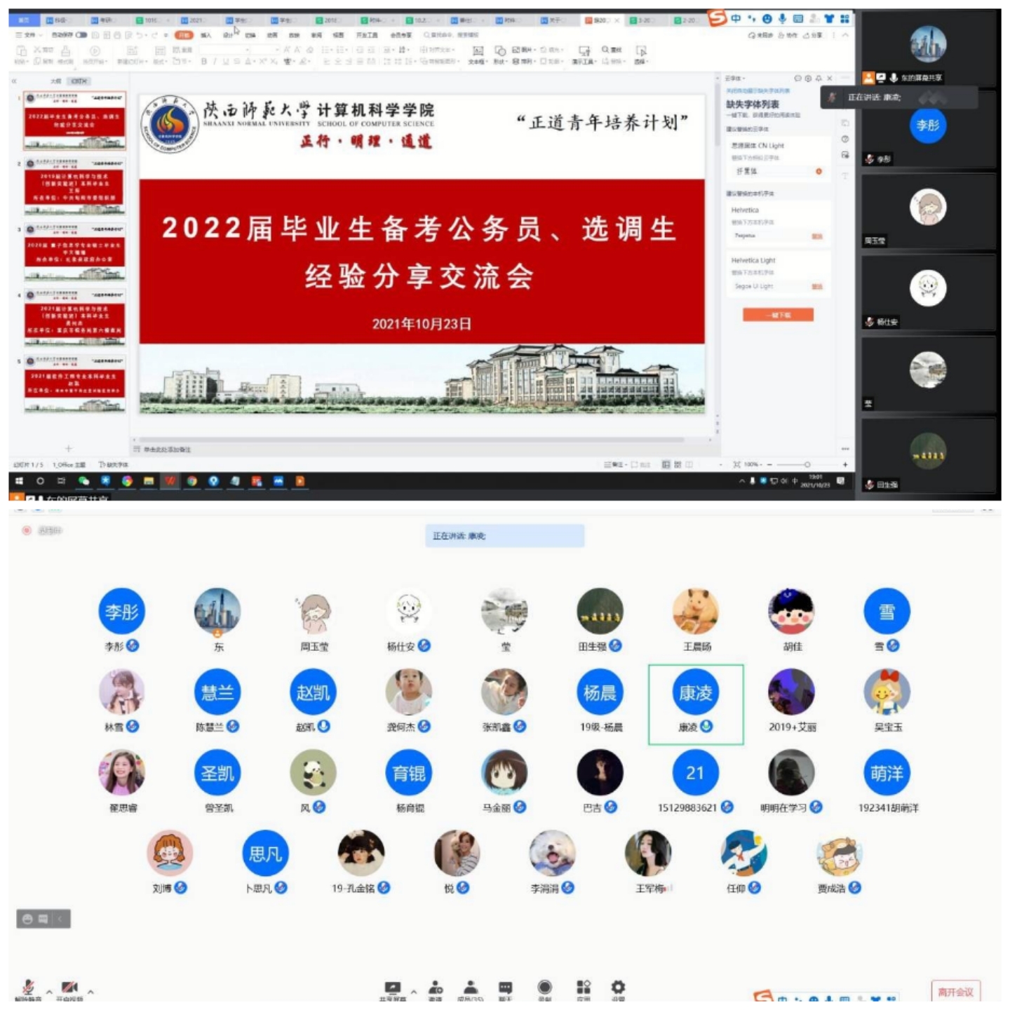 为进一步促进必赢官网2022届毕业生对公务员、选调生政策的了解,帮助同学们做好备考、就业相关准备,10月23日晚,我院通过腾讯会议形式举办“正道青年培养计划”之2022届毕业生备考公务员、选调生经验分享交流会。学院4位考取了公务员、选调生的优秀校友分享备考经验,毕业班辅导员田海东、2022届意向公考的本科生、研究生,学院其他低年级有意向了解公考相关情况的同学参加会议。会议由学院党委副书记郭康凌主持。
