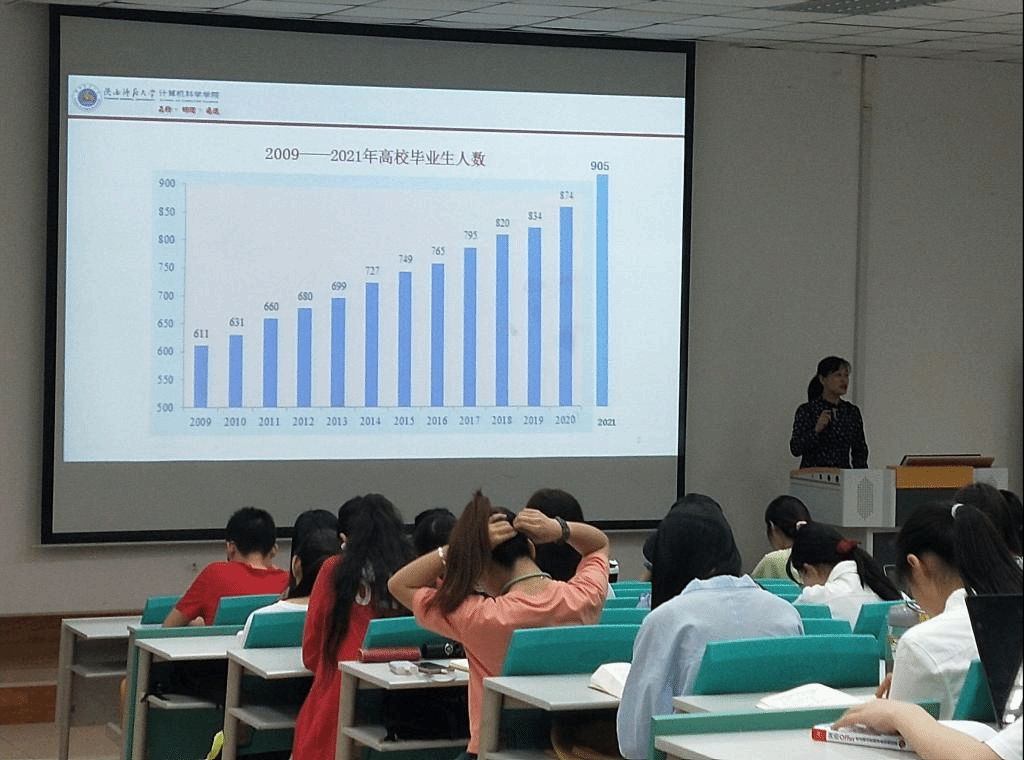 袁老师通过官方数据对目前就业形势进行了分析,近些年毕业人数上涨,就业竞争压力逐年增大,但计算机专业的就业形势较好,且薪资较高。接下来,袁老师对《大学生就业指导概论》这一课程进行详细解说,主要从课程性质、教学模式、考核方式和课程教材四个方面展开介绍。随后,袁老师对学校的就业政策进行说明,简要介绍了毕业生就业指导服务中心的工作,并对国家就业创业政策,如扩大基层项目、补充教师队伍、科研助理等进行说明;最后是学校管理制度。袁老师重点讲解《就业协议书》的填写规范,通过实例照片讲解注意事项、签约流程、生效日期、丢失协议书处理办法等,同时对违约和改派政策进行讲解。
