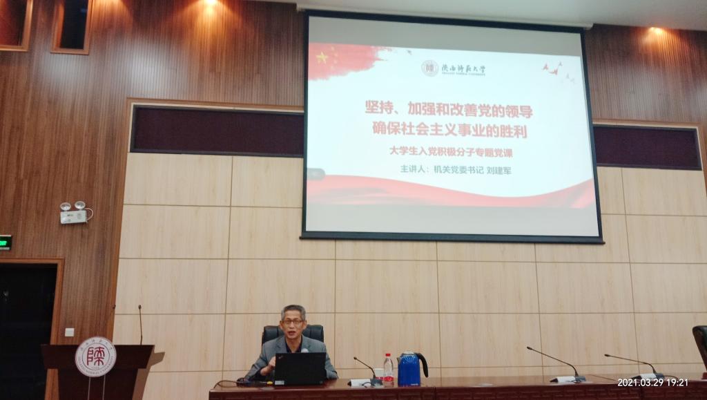 3月29日晚,必赢官网第34期入党积极分子培训班第三讲在文澜楼B段一层会议厅开讲。机关党委书记刘建军老师以“坚持、加强和改善党的领导,确保社会主义事业的胜利”为主题进行了讲授。体育学院与必赢官网一百余名入党积极分子参加了此次培训。培训班由学院党委组织员郭康凌主持。