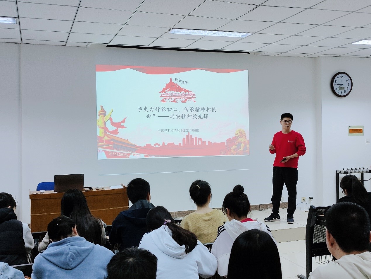 随后,支部邀请我校新时代大学生理论宣讲团成员、马克思主义学院2020级中国近现代史基本问题研究专业博士研究生赵俊鹏进行了题为《延安精神放光辉》的党史学习教育理论宣讲,其以历史人物、历史故事着手,为大家生动地介绍了延安精神的主要内容,彰显了扎实的理论功底和优秀的演讲才能。